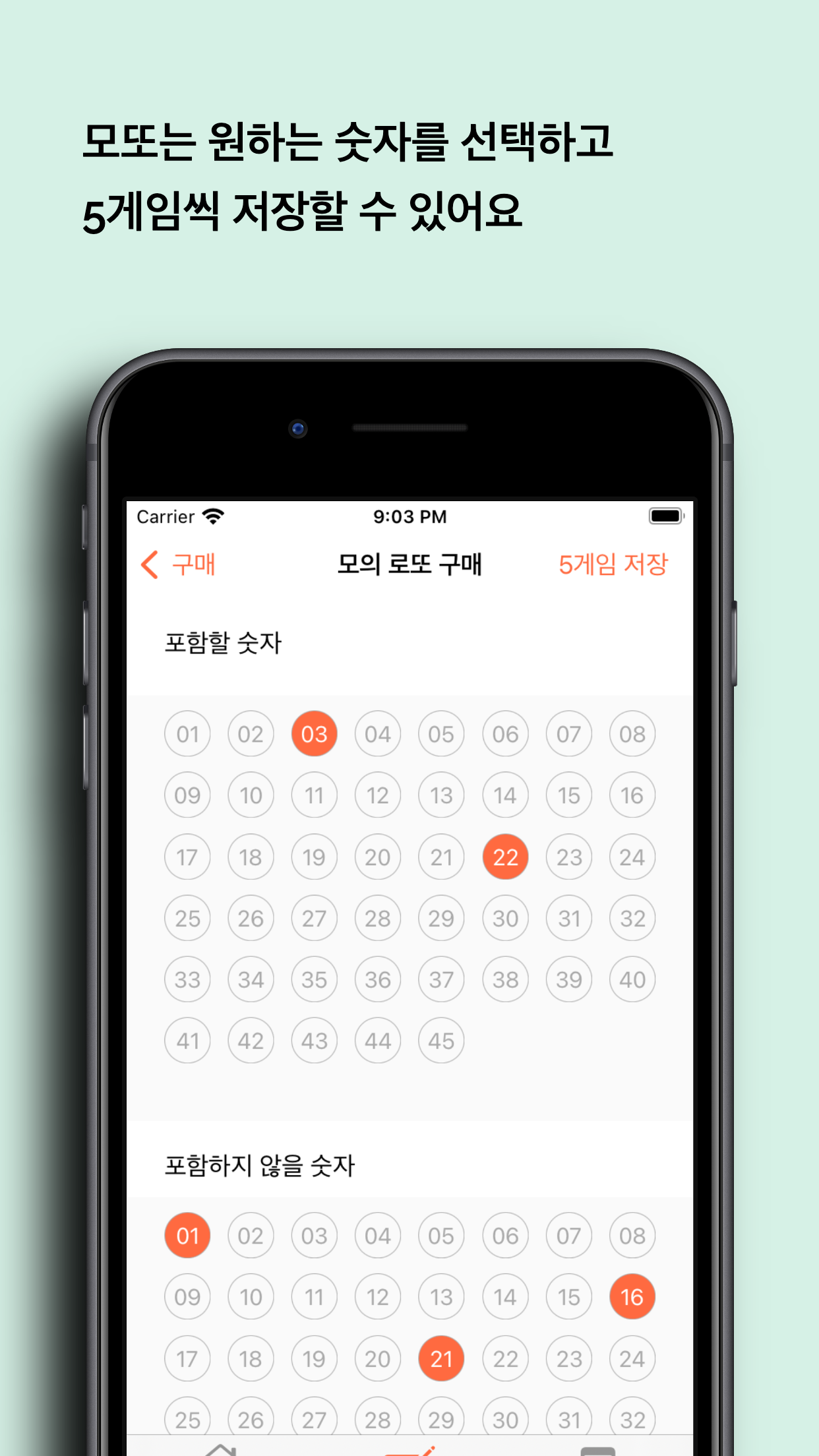 - 포함할 숫자, 포함하지 않을 숫자를 선택하고 저장하면 5게임을 한번에 저장합니다. 저장된 정보는 로또 용지처럼 확인 할 수 있어요