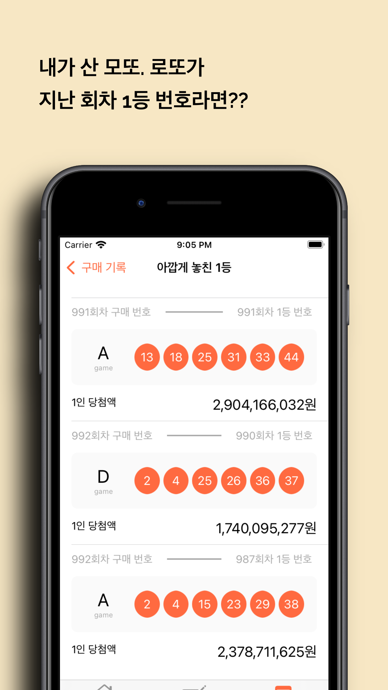 - 구매 기록에서 1등이 될 뻔한 번호를 보여주고 당첨금액도 보여줘요(배 아프쥬..?)