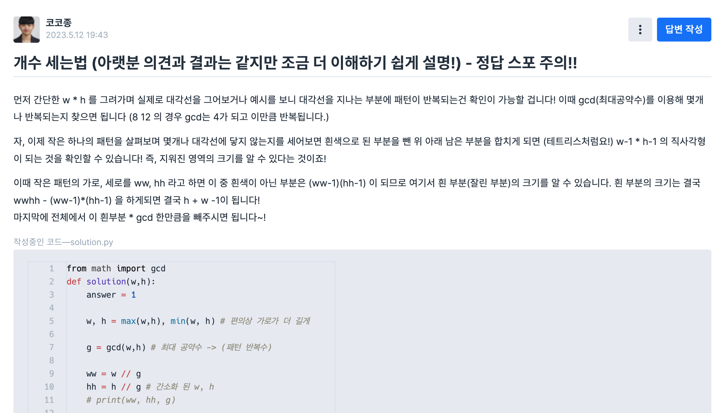 또한 프로그래머스 '멀쩡한 사각형' 문제를 풀다가 나온 아이디어를 설명하는 글도 써봤답니다! 이미 나온 내용이지만 자세하게 설명해주신 분이 없고 공식만 띡 있는 점이 아쉬워 설명을 덧붙였습니다.