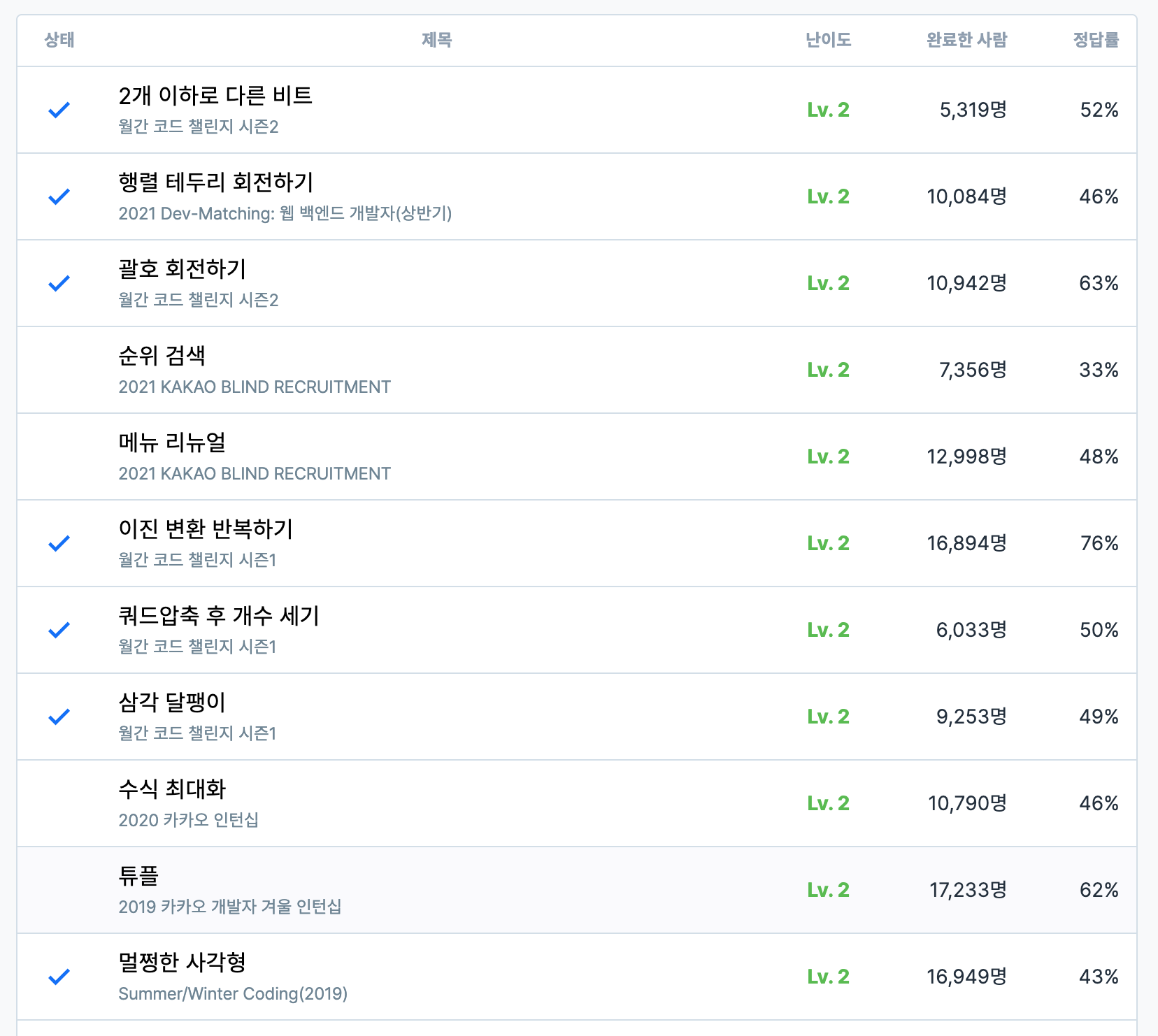 코딩테스트는 직접 풀어봐야 실력이 또 느니까 2레벨 문제를 정복중입니다. 이제 1, 2페이지와 카카오가 남았네요! (카카오 너무 싫어효..)