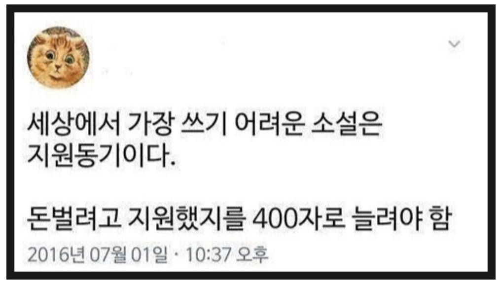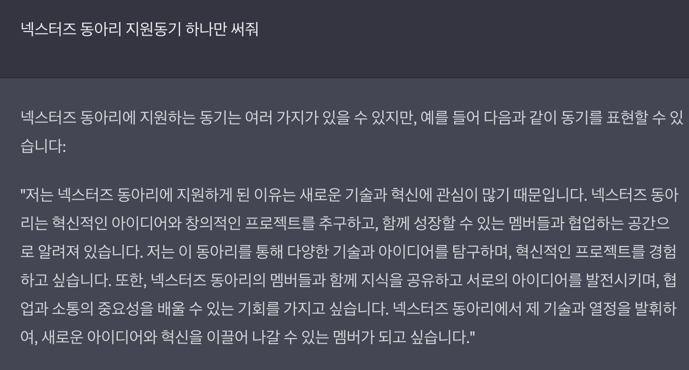 킹갓제너럴 AI씨가 써준 글에서 느껴지시는게 있나요? 혹시 읽고나서 기억에 남는게 있으셨나요? 수많은 서류를 검토하는 입장에서 이런 지원서가 들어왔다고 생각해보세요. 어떤 선택을 내리실 것 같나요? 저희도 똑같습니다. 이번에도 비슷한 내용의 지원서가 100개정도 들어왔습니다.(AI로 썼다는게 아닙니다) 지원하실 때는 본인의 이야기를 잘 풀어주신다면 수많은 글중에서 돋보이니까 꼭! 참고해주세요!