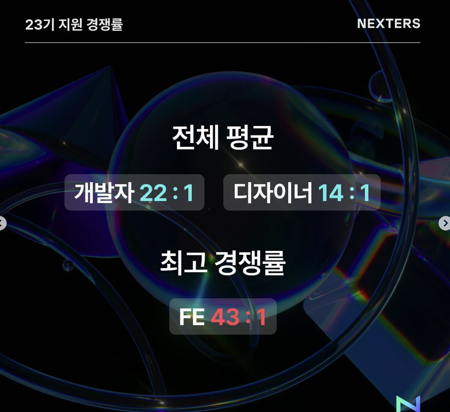 먼저 많이들 궁금해 하실법한 경쟁률입니다.. 이 경쟁률은 인스타그램 공식 계정에 올라가 있는데요, '이게 동아리 경쟁률이 맞나!' 싶긴하지만.. 감사하게도 그만큼 많은 분들이 넥스터즈를 좋은 동아리라고 알고 계시는 덕분에 경쟁자가 무지막지하게 많았습니다.