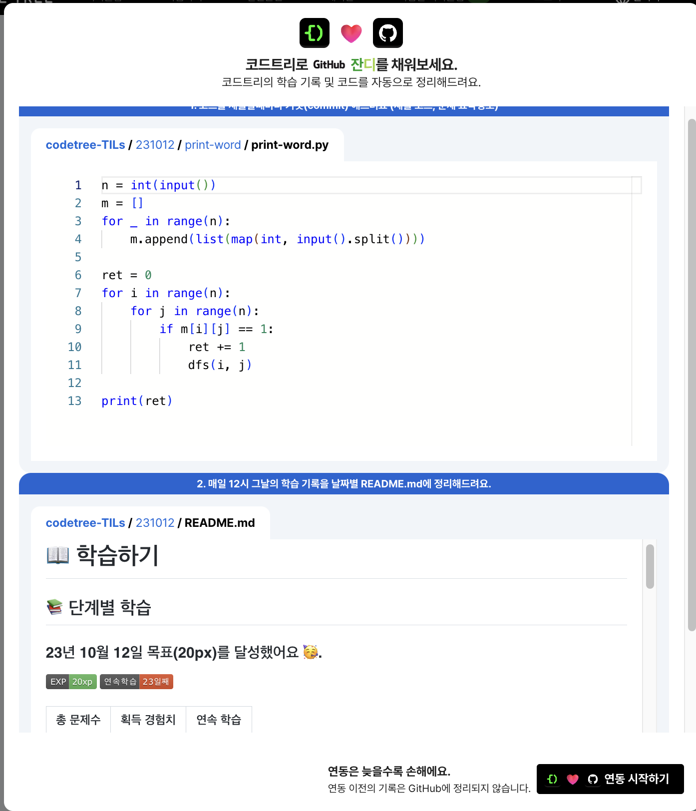 개발자의 숙명중에는 '잔디'도 있는데요, 코드트리는 내가 코드를 제출한 내역을 매일 밤에 모아서 자동으로 레포에 올려준답니다!