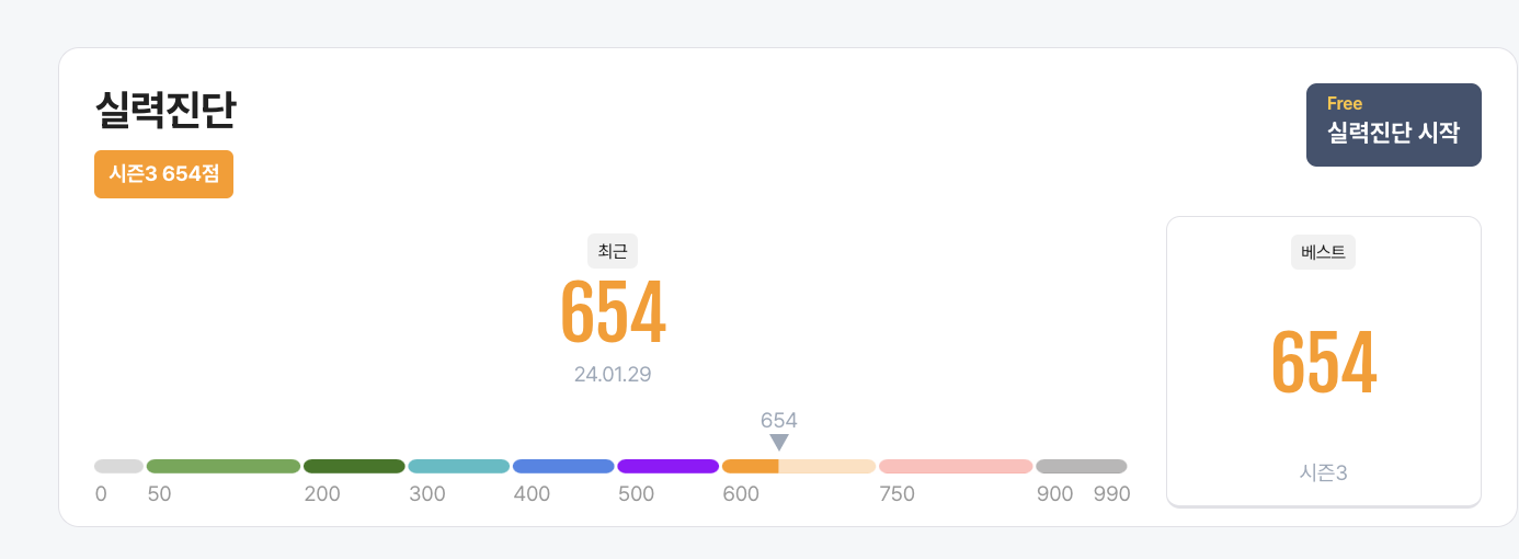 그리고 실력진단은 여러번 응시할 수 있기 때문에 시간이 조금 지나고 내 점수가 올라간 모습을 본다면 조금 뿌듯할지도?