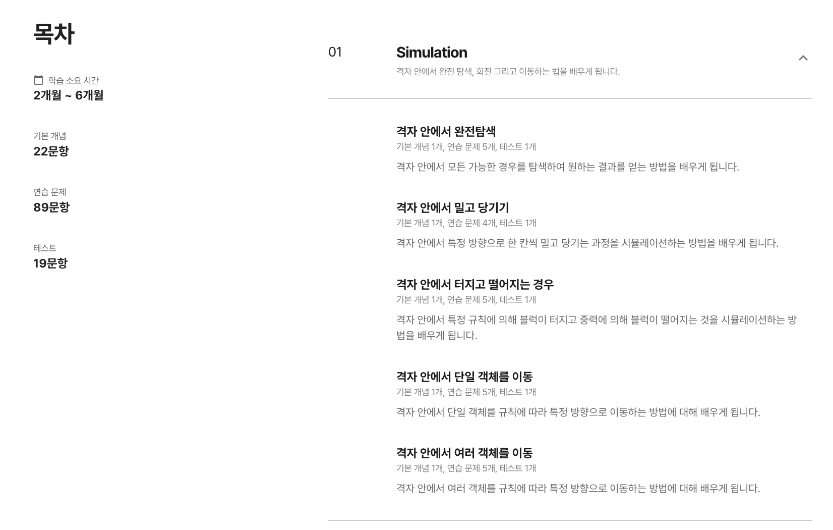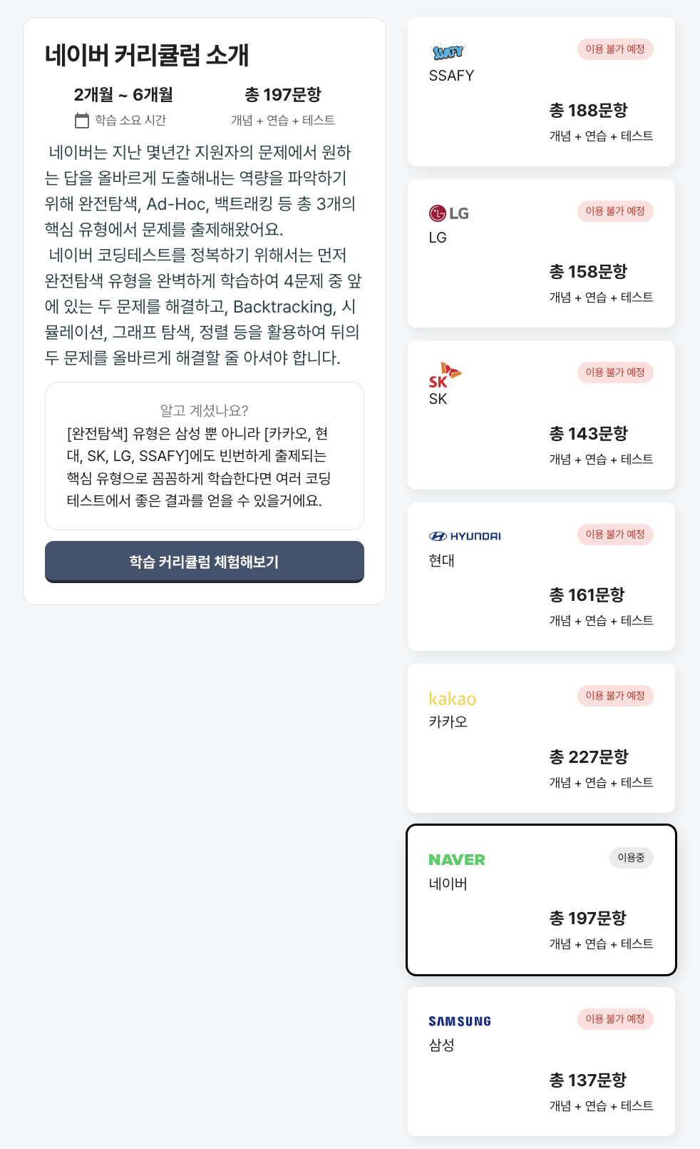 또 기업별 커리큘럼이라고 네이버, 카카오, 삼성 등 기업에서 자주 출제되는 유형들을 위주로 실전 문제들을 풀어보는 커리큘럼이랍니다.