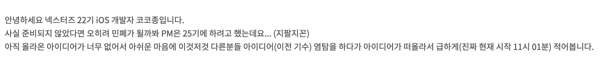 그런데 왜 생각이 없던(준비가 덜 되었다고 생각한) PM에 도전을 하게 되었느냐~ 라고 한다면 이런 프로세스 때문에 미리 이번 기수에서 하고싶은 프로젝트를 마음속에 찜꽁😘 할 수 있는데요. 앱으로 만들고 싶어하는 서비스는 절반 정도였기 때문에 선택할 수 있는 선택지가 별로 없었습니다. 그중에는 아쉽게도 제가 '이거다!!'하는 프로젝트가 없었습니다. 🥲